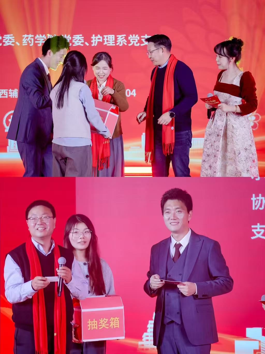 联欢会开始前,医学部首先举行了庄重而温馨的2025年度教职工荣休仪式与迎新仪式。医学部党委副书记陈晨主持仪式。医学部常务副主任雷利利为荣休仪式致辞,基础医学院党委书记李峥嵘、药学院院长王嗣岑分别向吴小健、侯樊兴、王晓美、徐新朝、尚荣军等五位荣休教师代表献花并赠送纪念品,感谢他们为医学教育事业做出的贡献。随后,医学部副主任孟晓军致辞欢迎新入职教师,医学部副主任王友发、药学院党委书记张彦民向石亚雯、贺梦琦、鱼晓丹、杨晔、胡晓宣、杨妍琪、陈朋飞、苟望龙,贾兰兰,王旺,王竺衢,刘磊,李凯,马文静,王丽云,袁恒,原萌,周琨,谭婷等十九位新教工代表献花并赠送礼物,寄语他们传承西迁精神,共创医学未来。