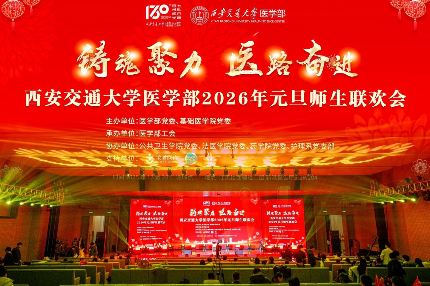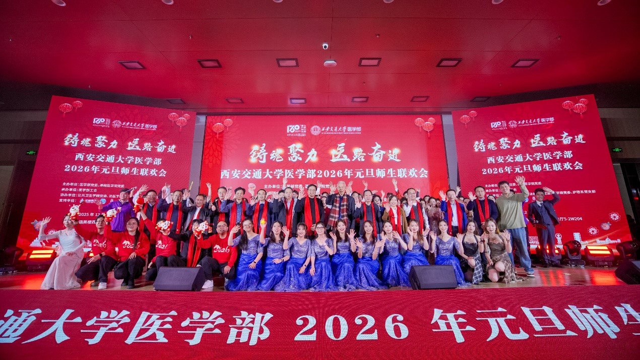 12月28日晚,西安交通大学创新港校区5-2W204灯火璀璨、暖意融融,师生代表欢聚一堂,以歌舞寄情、以欢声辞旧。西安交通大学医学部“铸魂聚力 医路奋进”2026年元旦师生联欢会在掌声和欢呼声中圆满落幕。本次元旦联欢会由医学部党委和基础医学院党委主办,医学部工会承办,公共卫生学院党委、药学院党委、法医学院党委和护理系共同协办。学校学工部副部长李新安,工会副主席谢志锋,医学部党政领导、各学院领导以及医学部师生近500人参加。