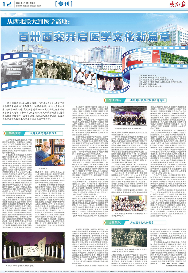 百卅弦歌不辍,杏林薪火相传。2026年4月8日,西安交通大学将迎来建校130周年暨西迁70周年华诞。从烽火岁月中走来,向世界一流迈进,交大医学赓续西北联大之薪火,开启西部医学教育之先河,扎根西北、服务国家,近九十载筚路蓝缕,将中国现代医学教育的一条重要血脉,深深融入这片黄土地,成为西部医学教育与医疗卫生事业当之无愧的中坚力量。