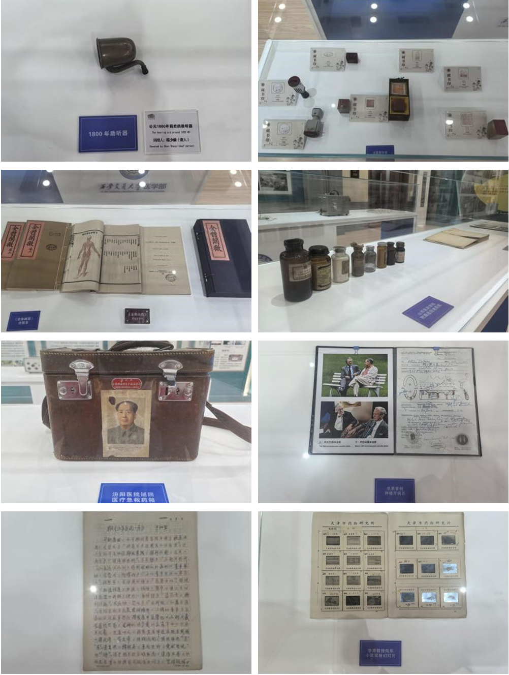 两百多年前的助听器,见证着科学技术的飞速进步;国立北京医学专门学校印章,镌刻着一代代学子奔赴杏林、求索新知的足迹;《全体阐微》仿制本,记录着医学先贤探索人体解剖未知领域的勇毅与智慧;山西医药学院附属医院的老药瓶、汾阳医院的巡回医疗急救药箱,留存着医者躬身基层、践履救死扶伤初心的鲜活印记;还有世界首例种植牙病历、干祖望《江苏医志》序言手稿、李漪教授纯系小鼠实验幻灯片……这些泛黄的史料、古朴的书稿,无声叙说着医学发展之路上的艰辛求索,将前辈学者精益求精、严谨审慎的治学行医风貌清晰呈现于观者眼前。