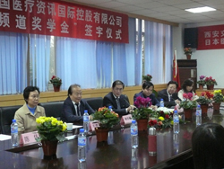 2007年10月27日下午3:00,西安交通大学--中国医疗资讯国际控股有限公司“24小时医学频道奖学金”签字仪式在医学院行政楼二层会议室举行。我校党委副书记兼副校长丘进教授、世界银行IFC机构投资项目管理中心执行副主任韩乐勤先生、世界银行IFC机构投资项目管理中心驻陕西首席代表王清莲女士、学生处处长徐文雄教授、医学院党委副书记王明旭教授以及学生代表等参会。