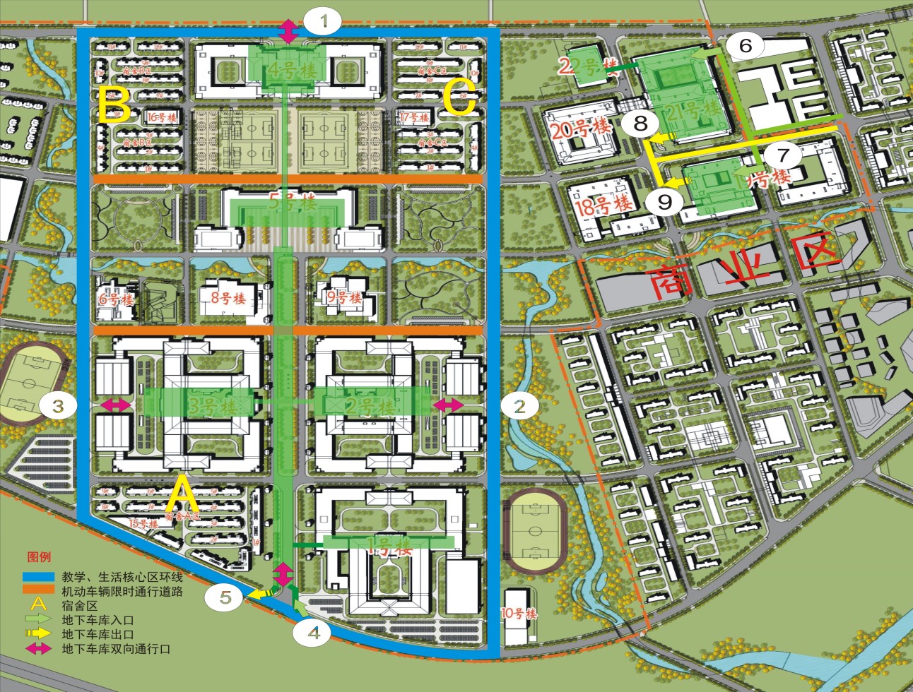 (七)5号巨构及核心地下室停车场入口:思源环南路东(一号巨构西南角);出口:思源环南路西(宿舍A区南侧)
