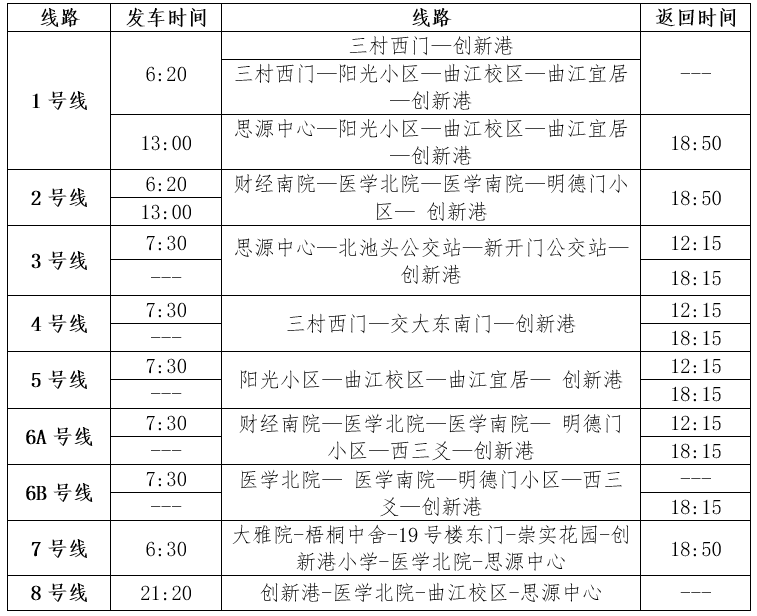 3.周六、周日及其他法定节假日创新港通勤班车发1、2号线13:00车次和4、5、6A号线全部车次。