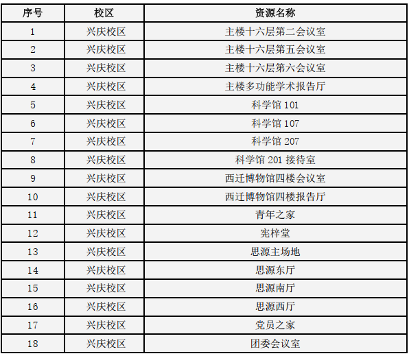 首批开放两校区校级会议室共40间(创新港22间,兴庆校区18间),详细资源列表请见附件。