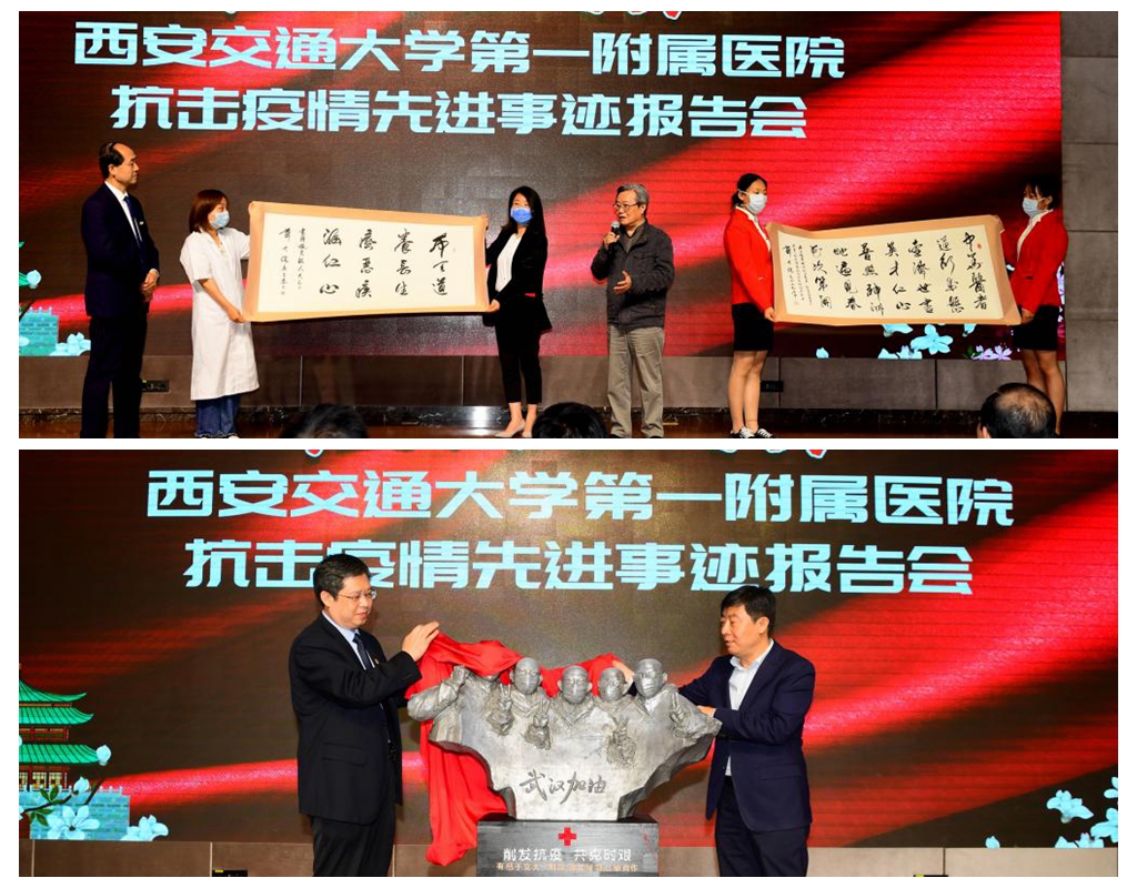 陕西省文化与旅游厅副厅长陈梦榆为医院赠送了以一附院“光头九姑娘”为原型,创作的抗疫雕塑作品《削发抗疫 共克时艰》,他表示,一附院的医务人员用自己的实际行动,诠释了对人民的真情、对党的忠诚和对国家的爱,他们的真、善、美激励着每个人在自己的岗位上,为国家“百年梦想”做出更大的贡献。马辛格书记向陈梦榆副厅长回赠医院纪念品。