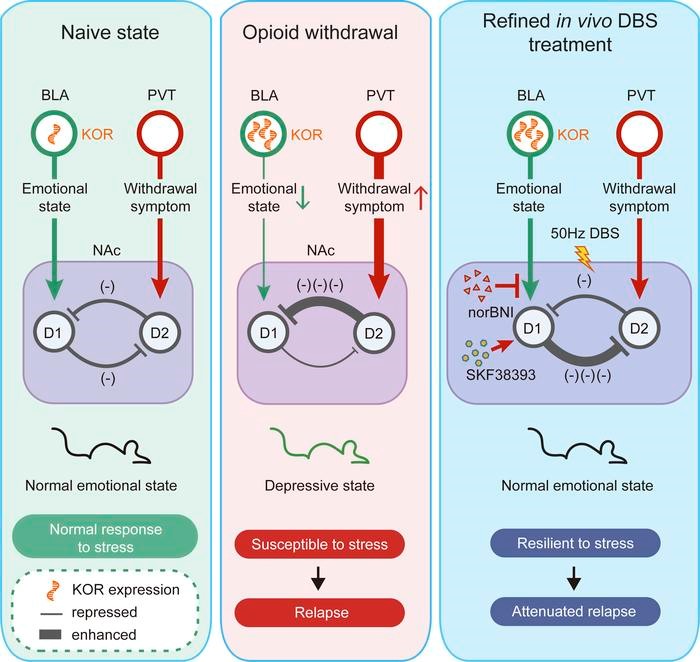 该研究通过成瘾人群数据采集、小鼠戒断与抑郁评估、抑郁行为相关性分析、抑郁行为聚类分析、受试者工作特征分析、D-score累加分析、相关性分析验证,突破性提出依据界值准确判断小鼠是否为戒断性抑郁。研究发现,低频刺激BLA→NAcD1可缓解吗啡急性戒断症状,同时NAc突触前高频刺激与突触后去极化BLA→NAcD1可改善吗啡戒断性抑郁;Cre/loxp与Flp/FTR双系统特异性敲除BLA→NAc KOR可改善吗啡戒断性抑郁;模拟光遗传学方案,50Hz DBS+KOR拮抗剂+D1受体激动剂可缓解急性戒断症状,改善抑郁并阻止复吸。因此,该研究基于细胞特异性环路完善了DBS治疗,从而减轻早期(生理)和慢性(心理)戒断症状并防止复吸。