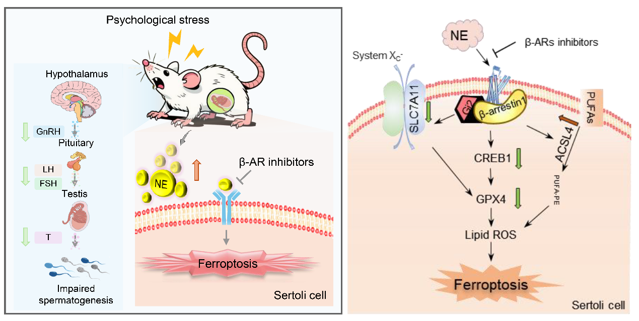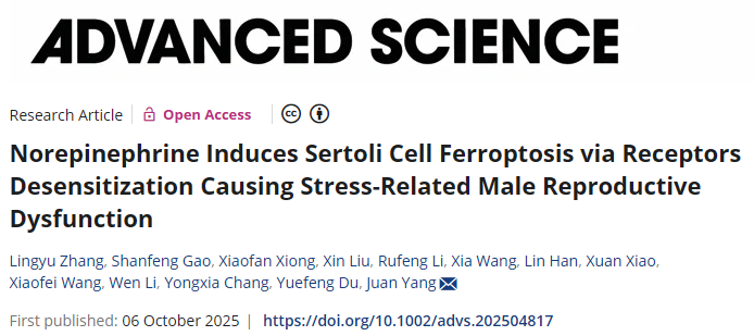 近日,西安交通大学基础医学院杨娟教授团队在国际著名期刊 Advanced Science 发表了最新研究成果,论文题为 “Norepinephrine Induces Sertoli Cell Ferroptosis via Receptors Desensitization Causing Stress-Related Male Reproductive Dysfunction”。该研究首次阐明了慢性心理应激通过去甲肾上腺素(Norepinephrine, NE)引发睾丸支持细胞铁死亡并导致男性不育的新机制。