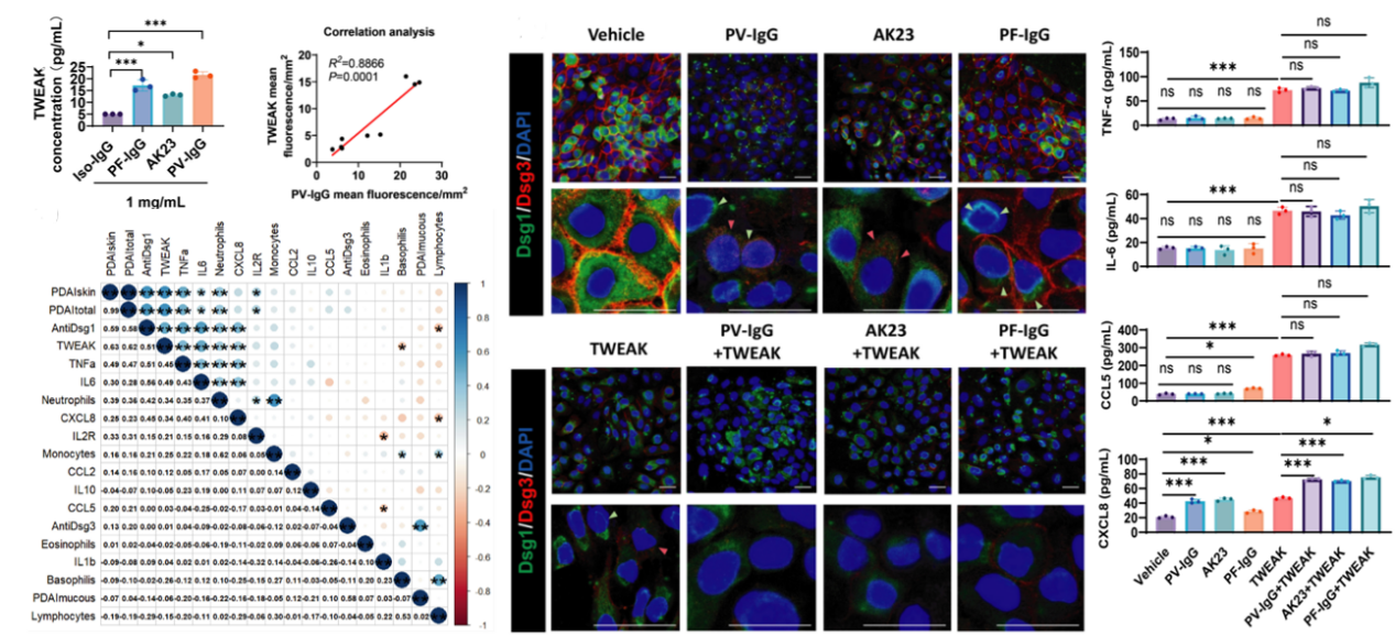 研究团队通过对60例新发PV患者及55名健康对照者血清进行分析,发现PV患者血清中抗Dsg1抗体水平不仅与疾病严重程度评分(PDAI)呈显著正相关,还与TWEAK、IL-6、TNF-α等炎症因子及趋化因子CCL5、CXCL8水平密切关联,提示全身性炎症状态与PV严重程度密切相关。进一步对患者皮损组织进行免疫组化分析显示,病灶局部存在TWEAK与PV-IgG的显著共表达,并伴有大量中性粒细胞、巨噬细胞及T细胞浸润,从组织层面证实了局部免疫炎症失调。