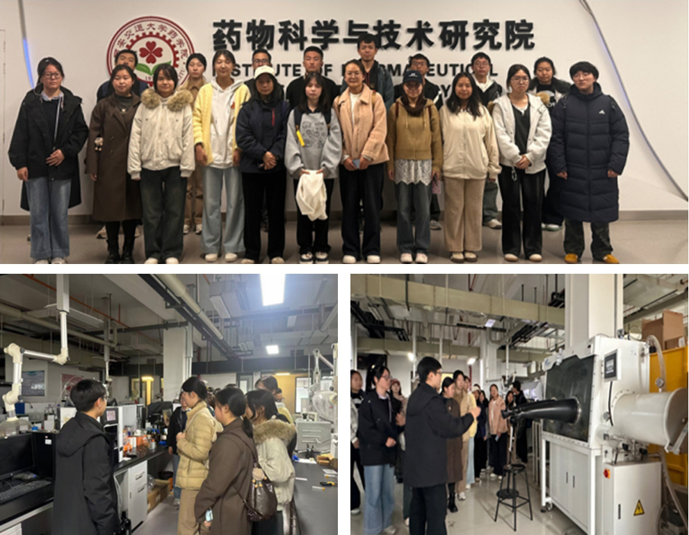 活动伊始,同学们依次参观了药剂实验室与药物化学实验室。从药物制剂研发全流程到精密仪器的协同操作,大家对“药物递送系统”与“新药合成”有了更直观的理解。现场讲解进一步揭示了药理学与主干学科的交叉融合,使抽象知识在实景中生动呈现,也让同学们对未来学习充满期待。