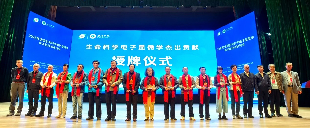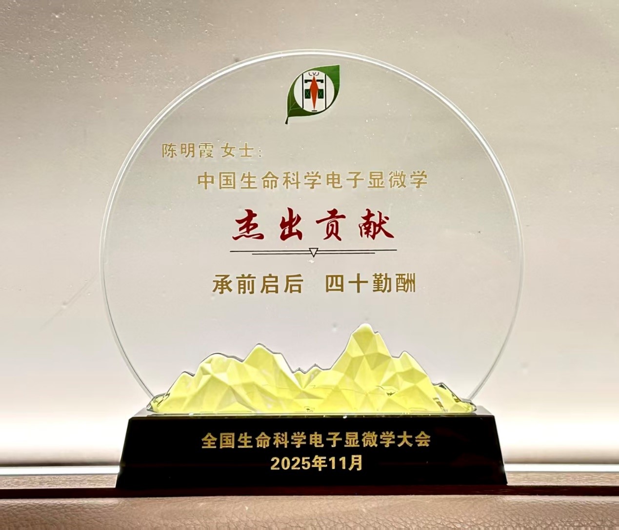 近日,在2025年全国生命科学电子显微学学术和技术研讨会上,医学部电镜室陈明霞老师因长期在医学电子显微学领域的卓越贡献,获得与会专家的高度认可,被评为“中国生命科学电子显微学杰出贡献者”,获得“中国生命科学电子显微学杰出贡献”奖。