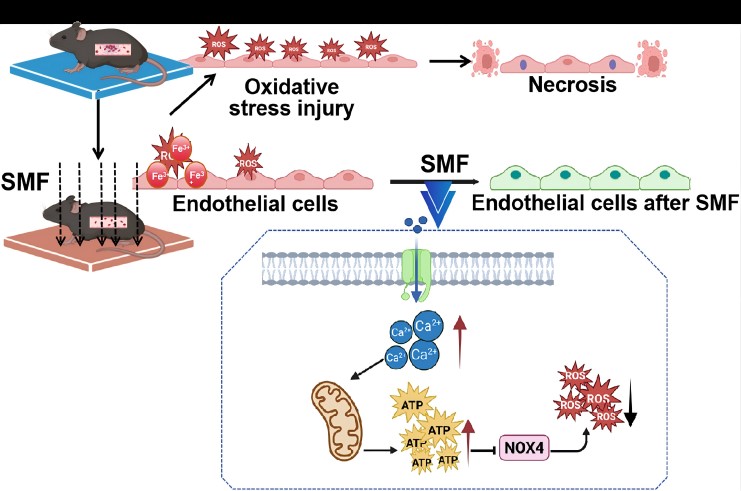该项研究创新性采用FeCl3诱导血管内皮细胞氧化应激损伤建立小鼠下腔静脉血栓模型,从而模拟临床手术中常见的因缺血再灌注引起术后血栓形成的病理过程。通过静磁场干预后的结果显示,中等强度静磁场(100-400 mT)可显著降低血栓发生率、缩小血栓体积、改善血流灌注,并提高动物生存率。进一步研究表明,其具体机制为SMF通过激活钙离子通道,促进细胞内ATP合成,进而抑制NOX4酶活性,减少过氧化氢(H2O2)等活性氧(ROS)的生成,有效缓解血管内皮细胞的氧化损伤与凋亡。该研究首次明确提出“Ca2+-ATP-NOX4”信号轴是SMF发挥血管保护作用的关键通路,填补了磁场干预血栓形成的机制空白,具有重要的科学价值和临床转化潜力。