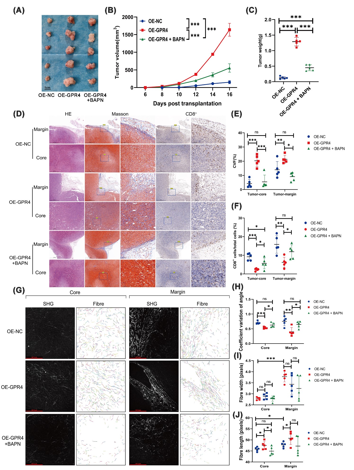 研究发现,作为氢离子感受器的G蛋白偶联受体GPR4在结肠癌中通过JAK2/STAT3信号通路发挥双重作用:一方面调控LOXL2促进胶原纤维排列,另一方面调节TGF-β增强I型胶原表达,从而推动细胞外基质的结构重塑与沉积,最终形成肿瘤免疫排斥性微环境,阻止免疫细胞的浸润。基于上述机制,任娟教授团队设计了通过抑制JAK2/STAT3通路或LOXL2功能来有效逆转肿瘤免疫排斥状态,显著提升了免疫治疗响应,并在动物模型中得到证实。这为提升结肠癌免疫治疗效果提供了新的靶向药物。