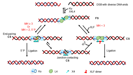 研究团队前期工作发现,NHEJ核心修复因子Ku70–Ku80、XRCC4–LIG4和XLF可介导平末端DNA形成两种结构不同的联会复合物:可变联会复合物(flexible synaptic complex, FS)和紧密接触联会复合物(close synaptic complex, CS),其中XLF是CS复合物形成所必需的关键因子。只有当DNA断裂末端处于CS复合物中时才可被修复蛋白复合物XRCC4-LIG4连接,完成DSB的修复。