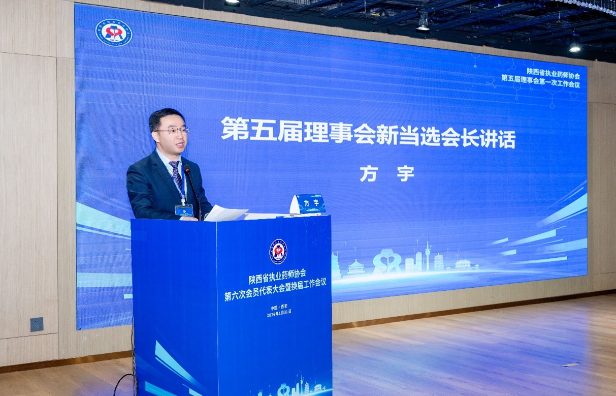 2026年1月31日,陕西省执业药师协会第六次会员代表大会暨换届工作会议在西安召开,来自全省药品研制、生产、经营、使用、监管和教育等领域的会员代表及药学工作者参加会议。省药品监督管理局党组成员、副局长宋健莅临指导并讲话,省级医疗卫生健康行业社会组织委员会联合党委副书记党忠诚出席会议并致辞。经大会无记名投票选举,药学院方宇教授当选为陕西省执业药师协会第五届理事会会长。
