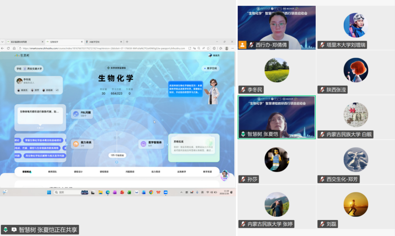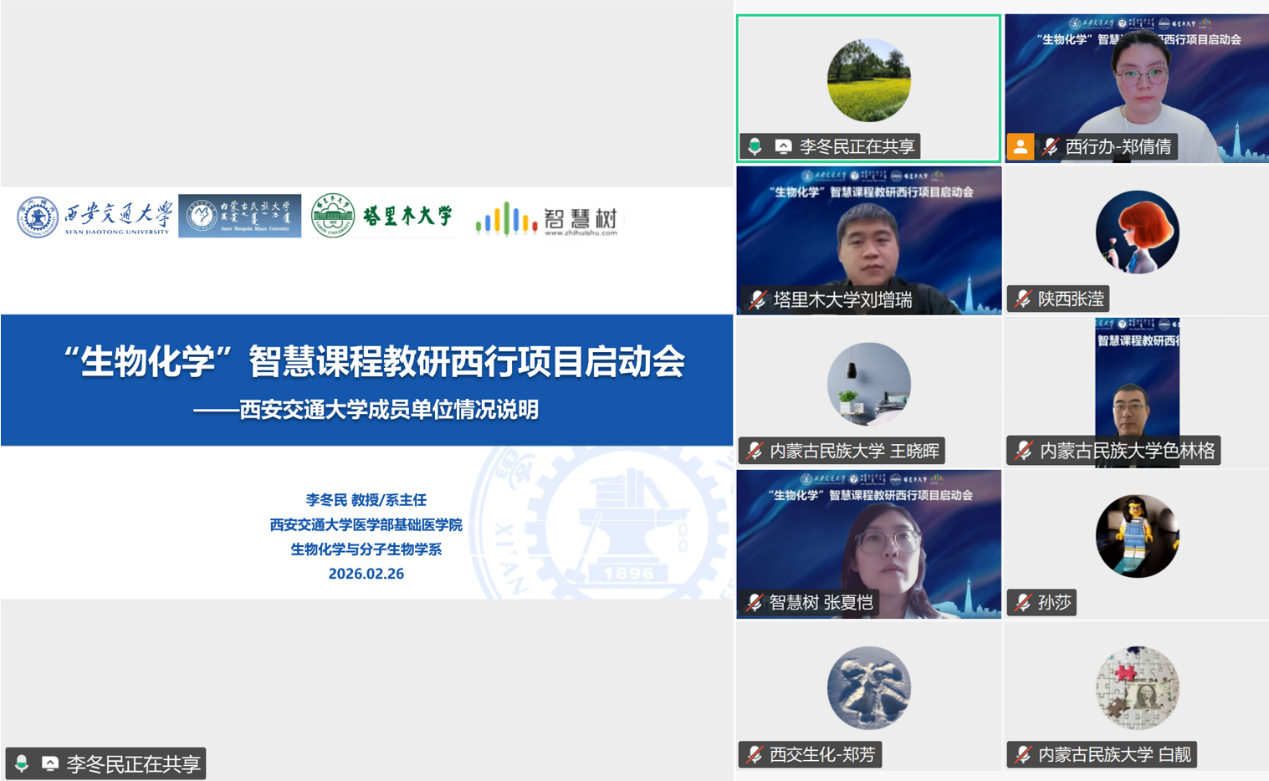 为深入落实“慕课西部行2.0”行动计划,积极响应“联盟智慧西行”号召,探索基于智慧课程的教研与教学新形态,近日,“生物化学”智慧课程教研西行项目启动会以线上视频会议形式成功召开。会议由西安交通大学联合东西部高校课程共享联盟慕课西部行办公室共同发起,来自西安交通大学、内蒙古民族大学、塔里木大学及智慧树网的项目团队齐聚云端,共谋智慧课程建设与跨校教研合作新篇章。