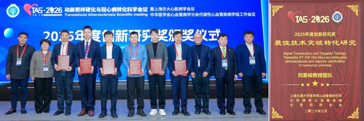 近日,由上海交通大学医学院心血管病研究所、北京德诺公益基金会及北京药师协会共同主办的“动脉粥样硬化与冠心病转化科学会议(TAS 2026)”在上海隆重召开。我校实验动物中心刘恩岐教授团队荣获“2025年度创新研究奖:最佳技术突破转化研究”,并应邀作题为《Tripeptide DT-109 (Gly-Gly-Leu) attenuates atherosclerosis and vascular calcification in nonhuman primates》的主题报告。