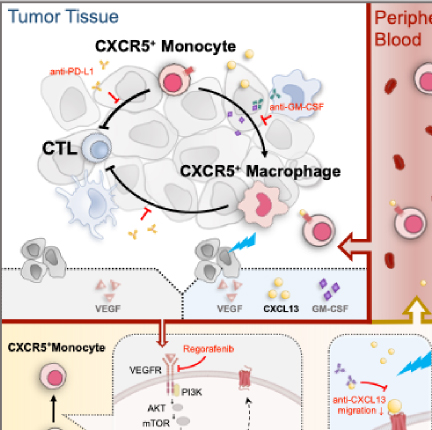 研究团队检测患者放射治疗前后肿瘤组织及外周血的单核细胞,结果表明受照肿瘤中存在CXCR5+单核细胞浸润,且放射治疗后进展的患者外周血单核细胞比例显著升高。在放射治疗时联合阻断CXCR5-CXCL13轴、抑制PD-1/PD-L1信号,中和GM-CSF,最终有效提升放射治疗的效果。阐明其机制为完善综合治疗策略,改善肿瘤患者预后提供了新的方向。