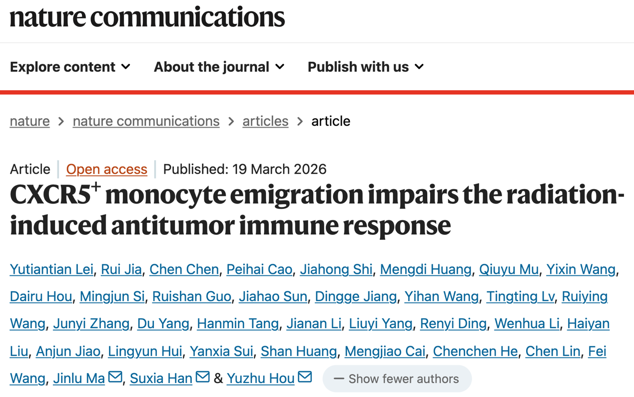 2026年3月19日,第一附属医院肿瘤放疗科韩苏夏/马瑾璐团队及基础医学院侯玉柱团队完成重要研究成果《CXCR5+ monocyte emigration impairs the radiation-induced antitumor immune response》(CXCR5+单核细胞向外迁移抑制放射治疗介导的抗肿瘤免疫应答),在Nature Communications发表。该研究首次发现CXCR5+单核细胞在放射抵抗中的重要作用,CXCR5+单核细胞的产生、迁移、功能,以及分化几个方面阐明了其抑制放射治疗介导的抗肿瘤免疫反应的机制,为放射-免疫联合治疗提供了理论依据,为肿瘤的综合治疗提供了新的治疗策略。