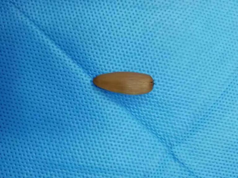 因为呼吸道异物是造成该患儿呼吸困难、气管破损的元凶,所以首要任务是取出异物。但由于患儿出现了气管损伤,纵隔气肿已经发生,全麻下正压通气很可能会导致纵隔气肿加重、进而发生张力性气胸、心脏受压导致心跳停止等危险。在局麻下实施手术会因为患儿的抵抗而增加手术难度,并且因为手术刺激导致的呛咳、呼吸道痉挛等情况也会导致纵隔气肿加重、呼吸循环衰竭的发生。当时患儿的氧分压只有正常人的60%,心跳120-160次/分,神志萎靡,生命危在旦夕。多学科会诊讨论后一致认为应该紧急手术取出异物,针对术中、术后可能出现的各种情况制定充分的应急预案。二附院耳鼻喉科孙斌副主任医师主刀,其他医师协助,在小儿外科、麻醉、手术室全力配合下,以最快的速度,最轻的刺激与损伤,自左主支气管内取出完整葵花籽一枚。术后患儿呼吸逐渐平稳,口唇面色红润,气促、喘息消失,心跳、血氧恢复至正常范围。